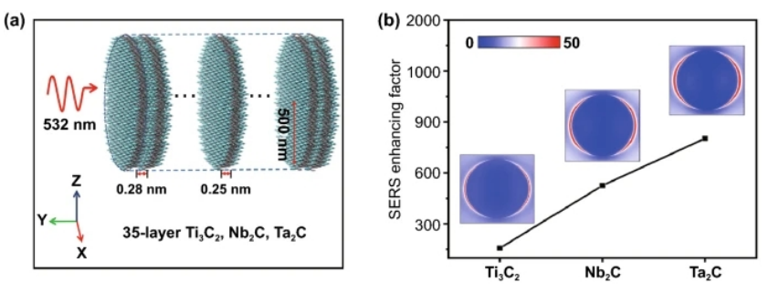 Figure 2. (a) MXene (Ti?C?, Nb?C和Ta?C)電場強度分布模擬模型。(b) MXene (Ti?C?, Nb?C和Ta?C)的模擬電場強度分布及相應的SERS增強因子。顏色條代表電場強度。