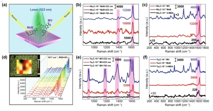 Figure 4. (a) 以Nb?C/Ta?C NSs為底物在532 nm激發激光下對MeB和MV分子進行拉曼散射的拉曼原理圖。在532、633和785 nm不同波長激光激發下,(b) Nb?C NSs襯底上的10?? M MeB和(e) Ta?C NSs襯底上的10?? M MV的拉曼光譜。(c) Nb?C NSs和(f) Ta?C NSs襯底在532 nm激發下對10?? M 4-MBA,MeB,MV的拉曼光譜。(d) 從Nb?C NSs基底上選取20個點采集10?? M MeB的拉曼信號和對應的1617 cm?¹的拉曼mapping圖像。