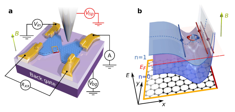 石墨烯由兩層絕緣六方氮化硼(藍色)保護,并定義了收縮形狀。四個金屬觸點(金)用于測量設備的電阻Rxx。背柵允許調整石墨烯電荷載流子密度。最后,尖銳的金屬尖端由電壓V尖端偏置,用于發現在量子霍爾機制中電荷載流子的反向散射發生的位置。(b)樣本邊緣的能量景觀示意圖(a 中的橙色區域,紅色邊框)。在高磁場下,能量被量化(遵循潛在景觀的藍色層)并且一維邊緣通道出現在這些水平與費米能量 EF(電化學勢能)交叉的地方。在這里,反向傳播的邊緣通道沿著相同的邊緣(藍色和紅色)流動,并且它們之間會出現一個反點(環),從而觸發電荷載流子反向散射。