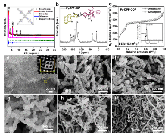 2吸附曲線(插圖是孔徑分布曲線)。(d) Py-DPP-COF的HR-TEM圖像(插圖中突出顯示了孔)。(e-i)分別為COF16 (e)、COF33 (f)、COF50 (g)、COF66 (h)和COF83 (i)的 SEM圖像。