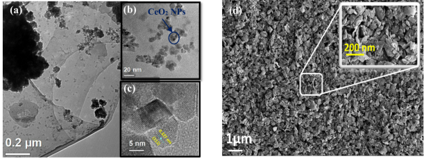 2(納米雜化物)在較低放大倍數下的TEM顯微照片。顯微照片顯示氧化石墨烯基體(灰色薄片)上存在二氧化鈰顆粒(黑點);(b) 更高倍率的 TEM 顯微照片顯示沉積在GO片上的CeO