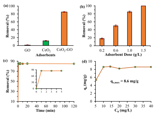 -/L(WHO 建議的飲用水限值),因此選擇了1 g/L作為最佳劑量;(c) 隨著時間的推移,GO-CeO