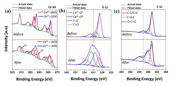 2在氟化物吸附前后的(a) Ce 3d 、(b) O 1s和(c) C 1s的XPS光譜;Ce 3d 中的紅線屬于Ce