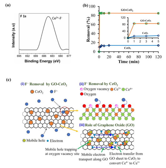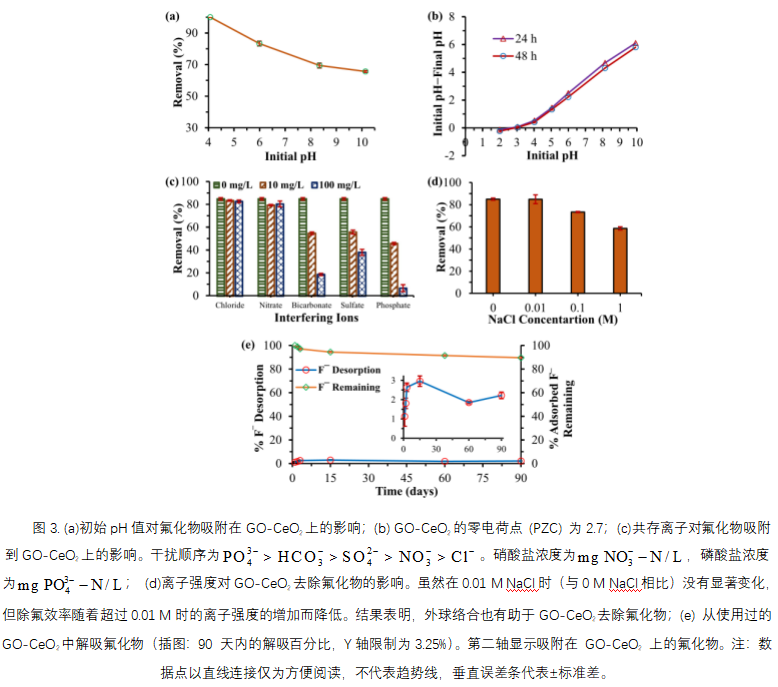 2去除氟化物的擬議機理示意圖(i) 帶負電的氟離子向帶正電的GO-CeO