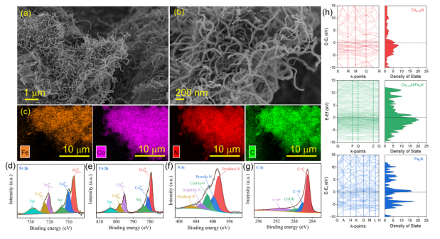3N @N-CNT-G的FE-SEM圖像;(c) 對(duì)應(yīng)Fe、Co、N、C元素的EDS映射;(d) Fe 2p、(e) Co 2p、(f) N 1 s和(g) C 1 s的高分辨率XPS 光譜;以及 (h) 分別為Co