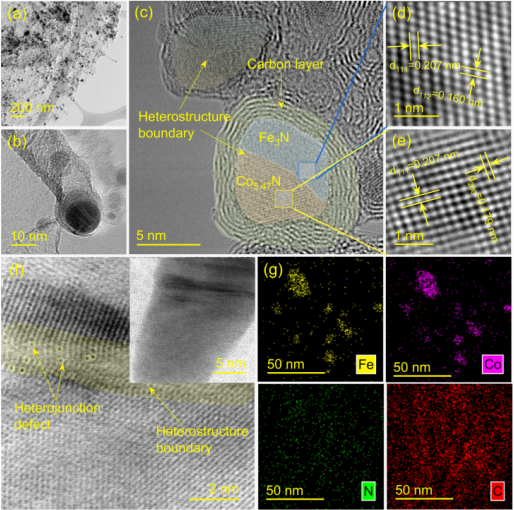 3N @N-CNT-G的 (a,b) TEM圖像、 (c,e) HR-TEM圖像和(f) STEM圖像;以及 (g) 對(duì)應(yīng)于Fe、Co、N和C元素的EDS顏色映射。