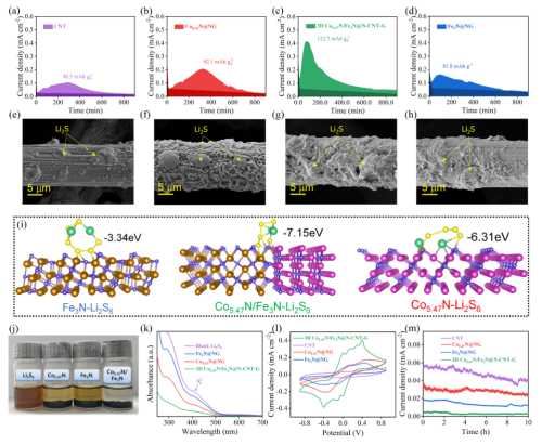 6結(jié)合能計(jì)算;(j)吸附可視化測(cè)試;(k)吸附測(cè)試后的UV;(l)對(duì)稱電池的CV以及(m)所有材料的穿梭電流測(cè)量。