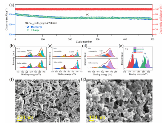 3N@N-CNT-G /S正極在1C下循環(huán) 500 次的循環(huán)穩(wěn)定性;(b-e) 分別為 Fe 2p、Co 2p、N 1 s 和 S 2p 的高分辨率XPS圖譜 ;(f-g) 長(zhǎng)期穩(wěn)定后的3D Co