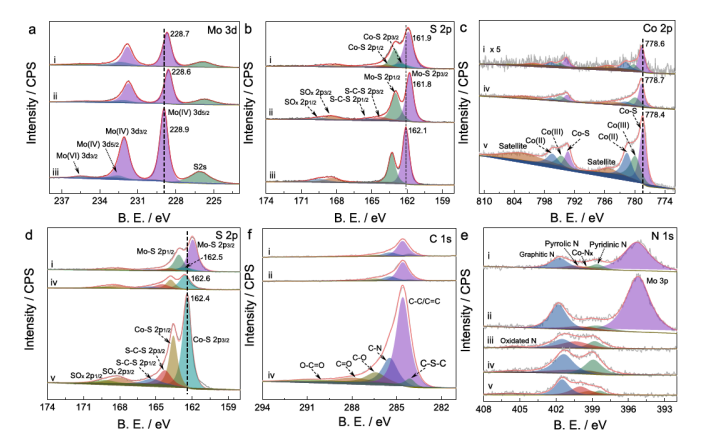 2/CC,和(vi) CoSAs-NS-CNTs@Co/CC的(e) N 1s的高分辨率XPS光譜;對于(i) MoS