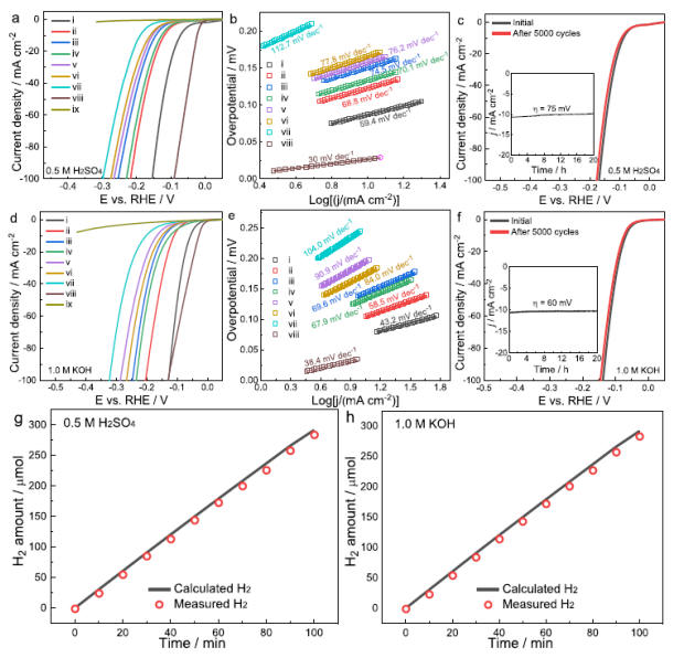 4中過電位72 mV (g)和1.0 M KOH中過電位56 mV (h)的氫量。