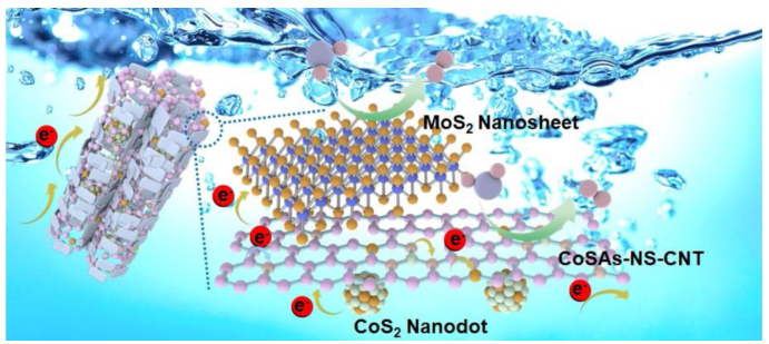 設(shè)計了一種由Co單原子錨定/氮、硫共摻雜碳納米管(CoSAs-NS-CNTs)組成的多組分3D單片電極。同時在在碳布(CC)表面裝飾超薄的MoS