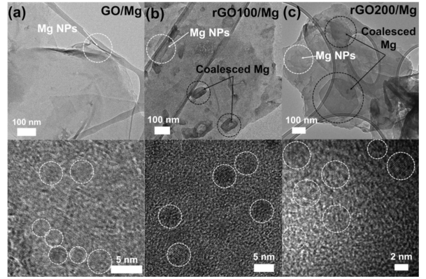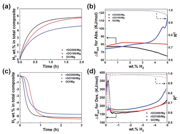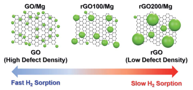 鎂的儲氫性能很大程度上取決于鎂粒子的大小和形貌,而這些大小和形貌決定了氫原子的擴散路徑。雖然Mg/石墨烯衍生物復合材料作為儲氫材料的研究已經深入,但對其與石墨烯衍生物的相互作用和Mg的形態演變的基本認識尚待闡明,最終實現其儲氫性能的調整。在這里,我們揭示了石墨烯缺陷在Mg的尺寸和形貌中的作用,并通過使用不同還原程度的石墨烯氧化物(GO)來控制Mg的均勻性。與缺陷石墨烯氧化物(rGO)相比,被更多還原石墨烯氧化物(rGO)約束的Mg納米晶體不僅具有更高的脫/吸附活化能壘,而且誘導時間也更長。Ab,initio計算表明,Mg和GO缺陷之間的相互作用主導了Mg化學勢,抑制了小Mg納米晶體的生長。