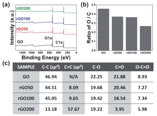 圖2 (a)制備的氧化石墨烯 (黑色)、rGO50 (紅色)、rGO100 (藍色)和rGO200 (綠色)的x射線光電子能譜,(b)氧/碳(O/C)原子比的變化,以及(C)基于峰面積計算的一系列rGOs的功能性百分比。