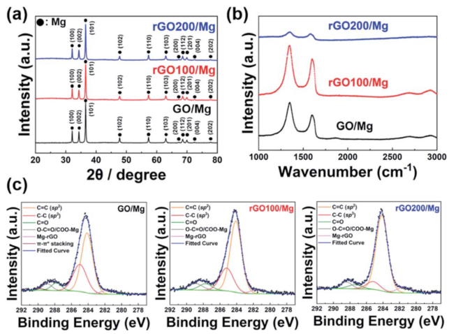 圖4. (a) GO/Mg(黑色)、rGO100/Mg(紅色)和rGO200/Mg(藍色)納米復合材料的x射線衍射圖和拉曼光譜,以及(c) Mg納米復合材料的x射線光電子光譜證明了rGO和Mg納米晶體的相互作用。