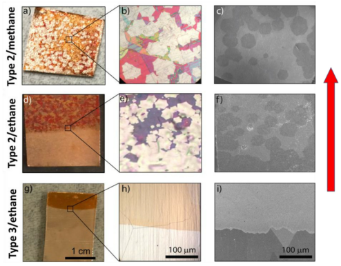 圖1. 兩種化學氣相沉積(CVD)石墨烯生長模式的演示:當使用甲烷作為前驅體(a-c)時,石墨烯通過遍布基底的成核顆粒生長;而使用乙烷作為前驅體(d-f)時,石墨烯在前端成核,當箔被限制在狹窄的空間(g-i)中時,成核前端更狹窄(沒有晶種擴散)。垂直箭頭表示氣流方向。前兩個的條件是相同的,即在2型和3型銅/鎳金屬箔上,在1070℃時,分別使用60 sccm的0.1% 甲烷/氬和60 sccm的0.05% 乙烷/氬以及500 sccm的2.5% H