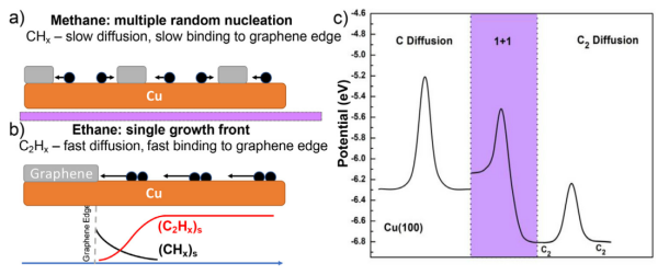 圖2. 說明甲烷(a)和乙烷(b)前體在石墨烯生長中的主要差異:(a)甲烷前體主要產生難移動的CH