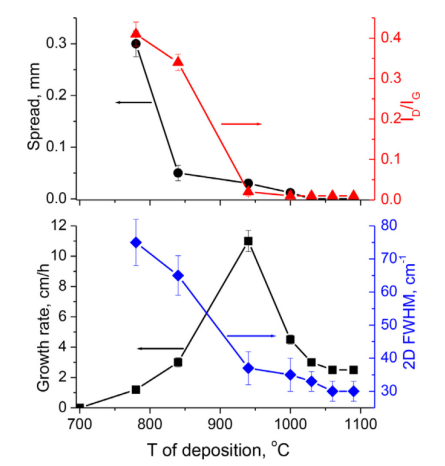 圖3. 石墨烯覆蓋的溫度依賴性,晶種的擴散和拉曼數據。石墨烯樣品使用60 sccm的C