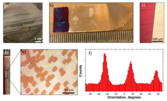 2/Ar,在3型箔上生長120分鐘的石墨烯的光學圖像;(c)石墨烯前端附近的放大圖像顯示清晰邊緣;(d)氫蝕刻后的前端圖像,顯示石墨烯中的蝕刻孔位于石墨烯邊緣上游狹窄的ca. 0.3±0.1mm帶中;(e)進一步放大的圖像顯示,孔具有拉長的六邊形形狀,并且它們的最長邊緣明顯平行;(f)這些六邊形孔在多個位置的邊緣取向直方圖顯示了三個尖銳的峰,它們以60°分開,對應于單晶狀石墨烯。