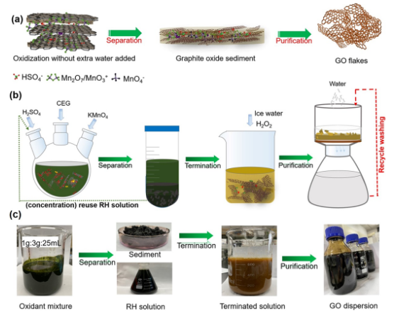 Figure 1. (a) 無水氧化工藝一步制備氧化石墨的示意圖,以及(b)氧化石墨的純化工藝。(c)每個步驟中產物以及最終氧化石墨烯產物的光學圖像。