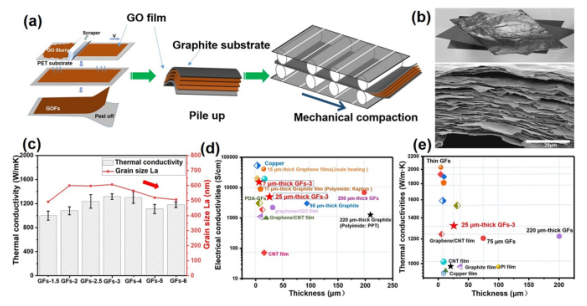 Figure 4.(a)氧化石墨烯薄膜(厚GOFs)的制備示意圖。(b)上圖呈現了不同厚度的石墨烯薄膜的光學照片,下圖顯示了橫截面SEM圖像。(c)不同氧化石墨烯薄膜的熱導率比較。石墨薄膜的(d)電導率和(e)熱導率與其他報道薄膜進行比較。
