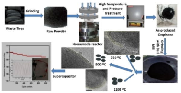 在這項工作中,通過一步法在高壓和高溫下,從廢輪胎中制備了高收益的氮摻雜石墨烯納米圓盤,該過程使用的是不銹鋼反應釜,且無需任何化學添加劑。在制備過程中反應溫度起著至關重要的作用,通過將溫度從600°C升高到1100°C,碳原子重新排列構建了納米圓盤和量子點的混合石墨烯結構。所獲得的石墨烯作為超級電容器電極時,具有優異的電容特性和長時間穩定性。它的比電容為 161.24 F/g,并實現了733.3 W/kg 的功率密度和27.1 Wh/kg的能量密度。這項工作的發現不僅為消除有害物質提供了解決方案,而且還提出了一種新意識,即將一些危險材料轉變為具有成本效益和經濟的納米材料;另一方面,該工作也闡明了廢棄物在電力上的潛在價值。
