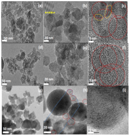 Figure 3.(a-i)不同樣品的TEM和HRTEM圖比較,圖(b)中的插圖呈現了相應的晶格條紋和晶格間距。