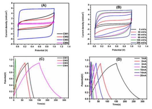 Figure 5. GND 電極的電化學測量:(A) 所有樣品在3 M Na2SO4溶液100 mV/s 掃速下的CV曲線,(B) CW4 在不同掃速下的CV曲線,(C)所有樣品在固定電流密度下的恒電流充放電曲線,(D)以及CW4電極在不同電流密度下的恒電流充放電曲線。