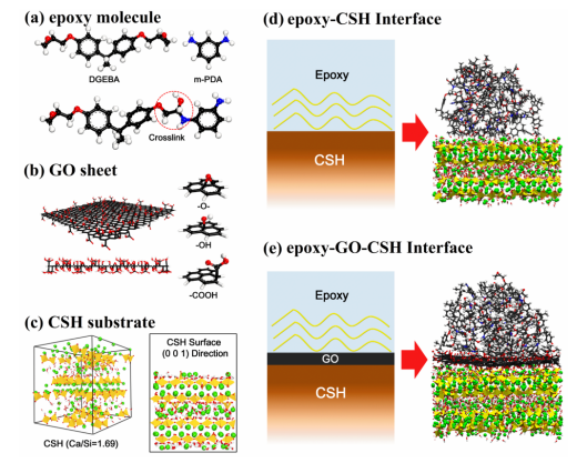 圖2. (a)交聯環氧樹脂分子、(b)GO片和(c)CSH基底的原子結構。(d)環氧樹脂-CSH界面和(e)環氧樹脂-GO-CSH界面的微觀示意圖(模擬快照取自界面模型的平衡狀態)