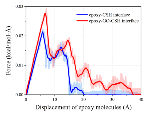 圖3. 環氧樹脂-CSH界面和環氧樹脂-GO-CSH界面的力-位移曲線。