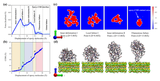 圖5. 環氧樹脂-CSH系統:(a)具有相應六個階段的力-位移曲線;(b)環氧樹脂分子質心(COM)的動態演化;(c)環氧樹脂分子與CSH基底接觸的均質等離子體,以及(d)相應階段的模擬快照。