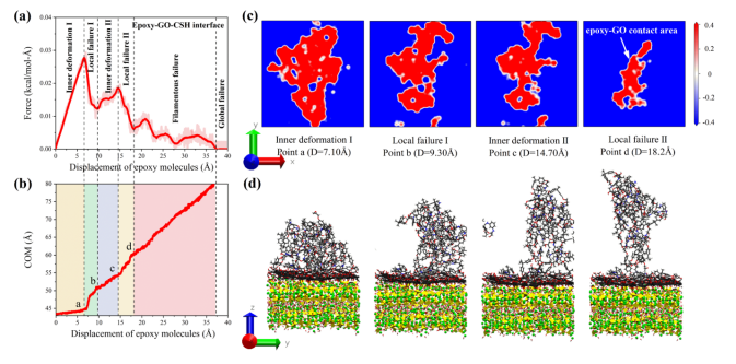 圖6. 環氧樹脂-GO-CSH系統:(a)具有相應六個階段的力-位移曲線,(b)環氧樹脂分子質心(COM)的動態演化,(c)環氧樹脂分子與CSH基底接觸的均質等離子體,以及(d)相應階段的模擬快照。