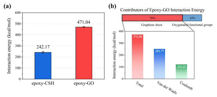 圖8. (a) 環氧樹脂-CSH和環氧樹脂-GO的相互作用能;(b)各組分(石墨烯片和含氧官能團)對環氧樹脂-GO相互作用能的貢獻。