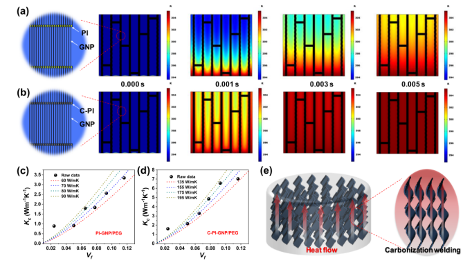 圖4. (a)PI-GNP/PEG和(b)C-PI-GNP/PEG骨架中熱傳導過程的有限元數值模擬。基于(c)PI-GNP/PEG和(d)c-PI-GNP/PEG復合材料的實驗數據,建立具有不同指前因子的模型擬合曲線;(e)C-PI-GNP骨架中熱傳導機制的示意圖。