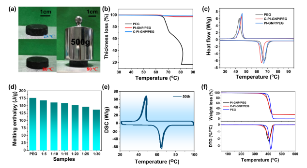 圖5. (a) C-PI-GNP/PEG復合材料在不同條件的熱臺上的數碼照片;(b) 在恒定壓縮載荷(4 N)下厚度隨溫度的變化;(c)PEG、PI-GNP/PEG和C-PI-GNP/PEG復合材料的DSC曲線;(d)不同C-PI-GNP/PEG樣品熔融焓的比較;(e)C-PI-GNP/PEG 1–20樣品的循環DSC曲線;(f)PEG、PI-GNP/PEG、C-PI-GNP/PEG復合材料的熱穩定性。