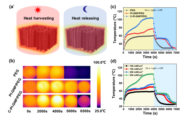 圖6. (a)C-PI-GNP/PEG在白天和夜間的熱量收集和釋放過程示意圖;在太陽模擬器輻射(250mW cm