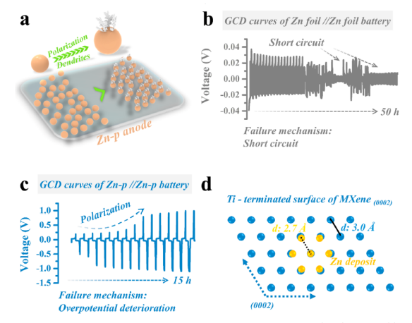 x MXene片作為電子和離子再分布器,構(gòu)建了穩(wěn)定、高可逆、無(wú)枝晶生長(zhǎng)、低極化的鋅粉陽(yáng)極。低的晶格失配(10%)使得沉積Zn的(0002)面和Ti