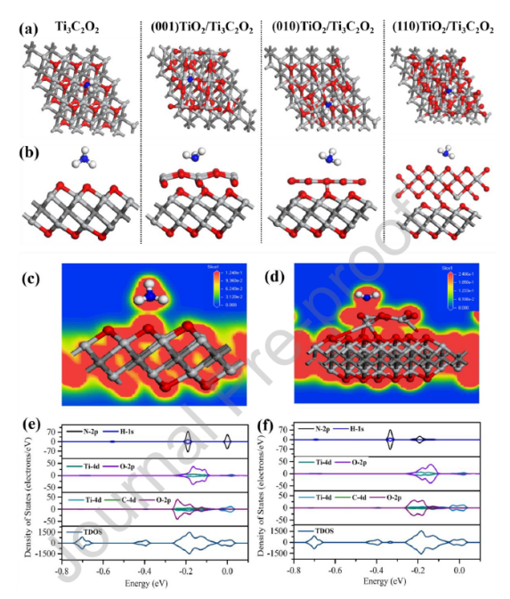 2的TDOS和PDOS (e)氨吸附前和(f)后。