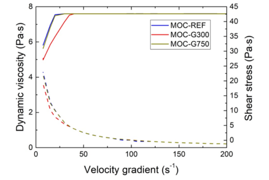 圖3. 新型復(fù)合材料MOC-REF、MOC-G300和MOC-G750的動態(tài)粘度和剪切應(yīng)力。