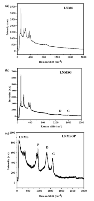 2(LNMS),(b)LNMS-G和(c)LNMS-G-PANI(LNMSGP)樣品的拉曼光譜。