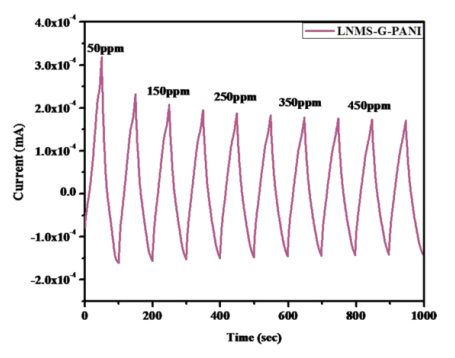 2-G-PANI(LNMS-G-PANI)樣品隨不同濃度HCl蒸汽的電流變化。