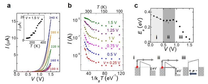 B T的Arrhenius圖。電流的值是從(a)部分沿0到+1.5V的I-V跡線得到的。(c)活化能E