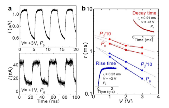 圖5. 鐵電半導(dǎo)體結(jié)中光電流的調(diào)制。(a) 在不同電壓V= +1,3 V,波長λ=633 nm、功率P