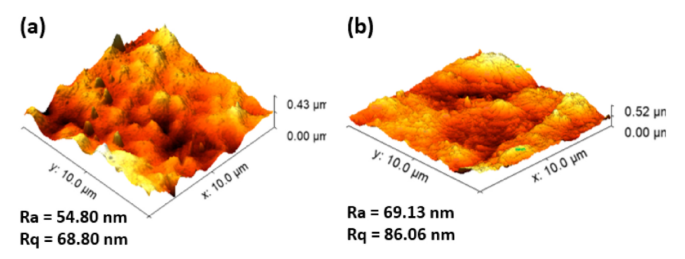 圖3. (a)原始陶瓷UF膜和(b)制備GO-陶瓷NF膜的AFM分析。