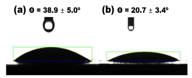 圖4. (a)原始陶瓷UF膜和(b)制備的GO陶瓷NF膜的水接觸角的代表性圖像。