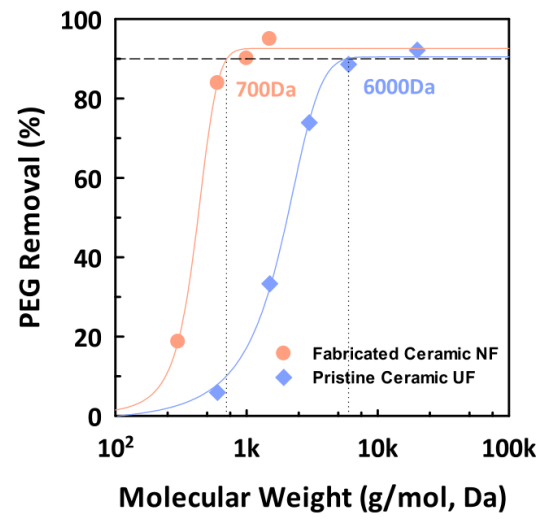 圖5. 分子量(MW)為300-20000 g/mol的聚乙二醇(PEG)溶液與原始陶瓷超濾膜和制備的GO-陶瓷納濾膜的累積分布函數(shù)。截留率基于測量的溶質(zhì)總有機碳(TOC)濃度。