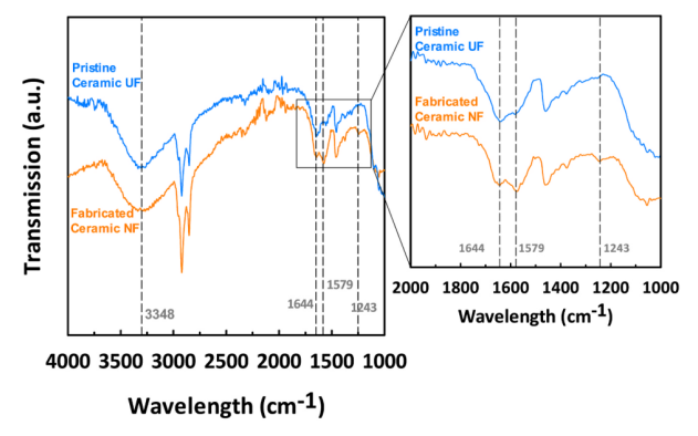 圖6. 原始陶瓷UF膜和所制備的GO-陶瓷NF膜的FTIR光譜。