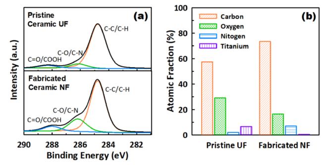圖7.原始陶瓷超濾膜和制備的GO-陶瓷納濾膜的表面XPS分析。(a) C 1s窄掃描光譜和(B)碳、氧、氮和鈦相對于陶瓷膜表面存在的元素之和的分數(shù)柱狀圖。