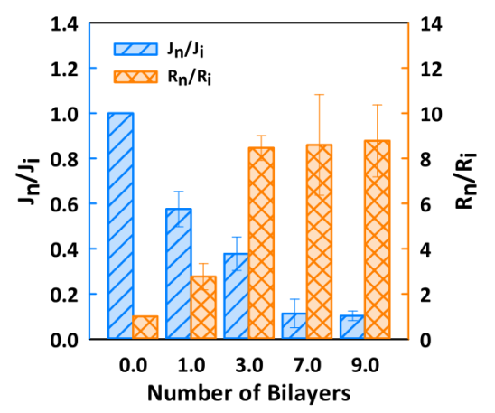 i)與涂在原始陶瓷超濾基底上的雙分子層數(shù)(n)的關系。0.0表示純凈的陶瓷超濾膜。