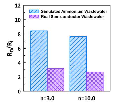 i)對模擬含銨和實際半導體廢水的氨去除率之比(n=3.0和n=10.0)。
