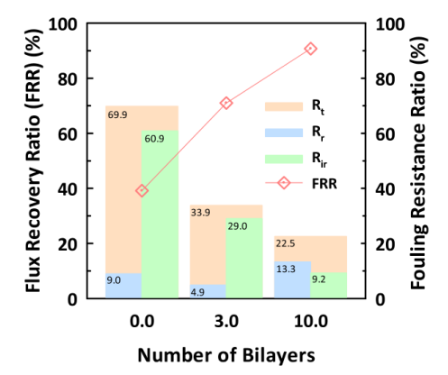 圖10. 實際半導體廢水的原始和GO-陶瓷NF膜的通量恢復率(FRR)和抗污染率。